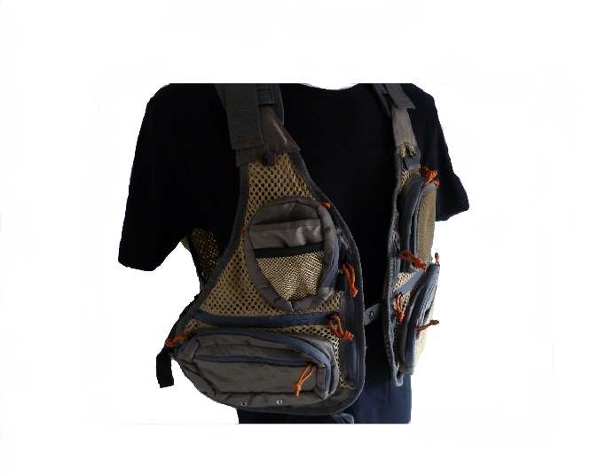 Gut ausgestattete, leichte Fliegenfischerweste mit vielen Taschen, in denen Sie alles mitnehmen können, was Sie für Ihren Angelausflug benötigen.